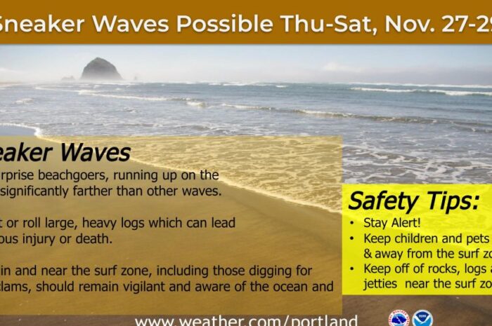 美国国家气象局波特兰预报办公室发布最新安全提醒:11月27日至29日(周四至周六),俄勒冈海岸线可能出现危险的 “鬼浪”(Sneaker Waves),提醒民众在感恩节假期前往…