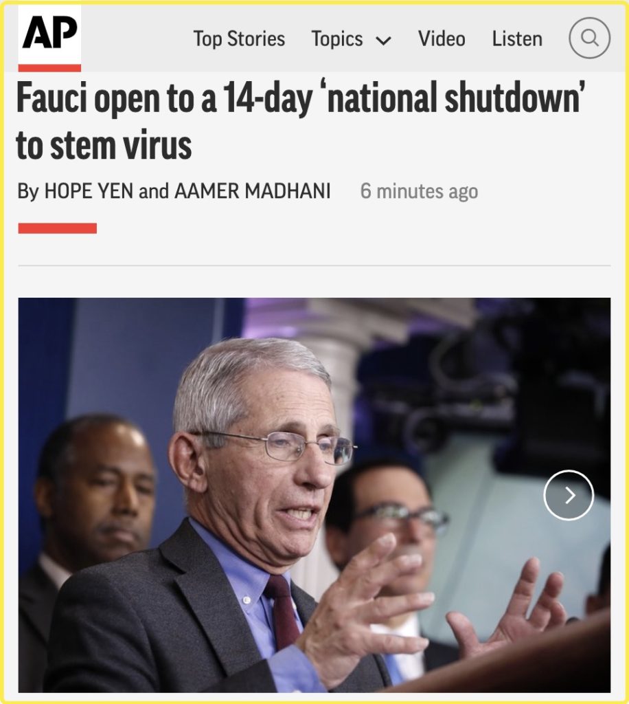 美联社称,政府首席传染病专家富奇(Anthony Fauci)星期日表示,他希望看到诸如美国关闭(national shutdown)14日之类的激进措施,这将要求美国人进一步努力减缓新冠病毒的传播!