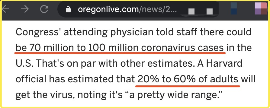 国会主治医师称,在美国可能有7000万至1亿例新冠病例。哈佛大学的一名官员估计,有20%至60%的成年人会感染该病毒。