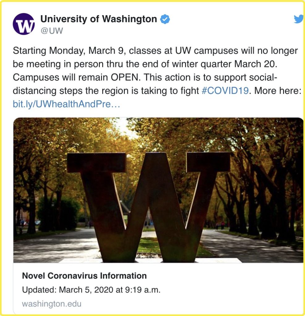 华盛顿大学3月6日星期五宣布,从3月9日星期一起,直至3月20日学期结束,所有课程都网上进行。对那些实在不适合网上学习的课程,可以提前出学期成绩。