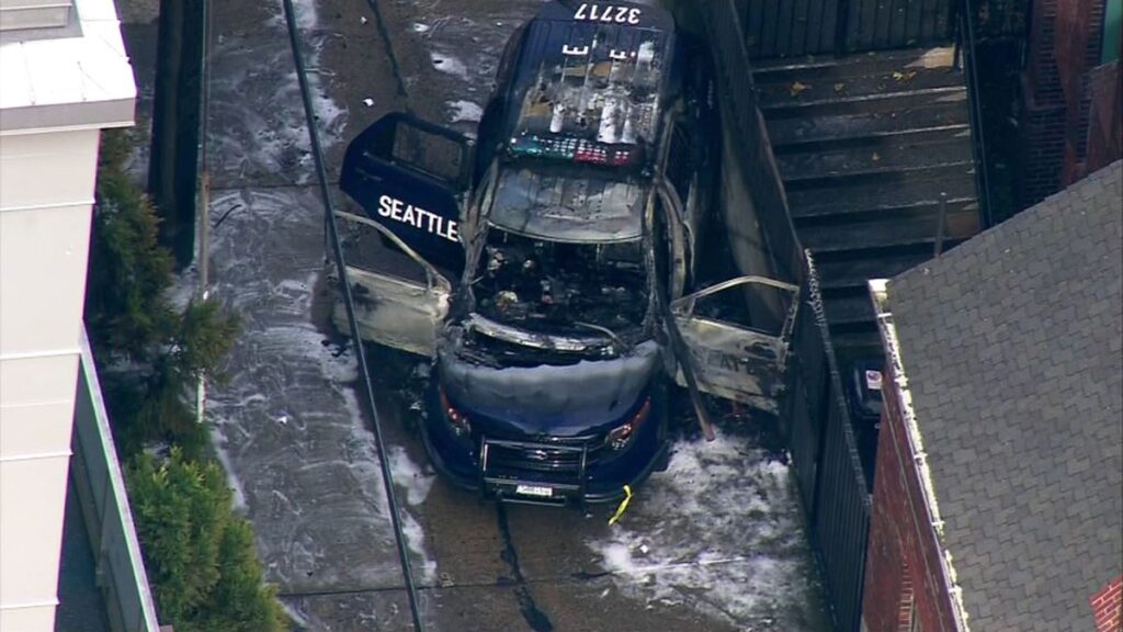 原文标题:1 in custody after Seattle Police car set on fire with officers inside