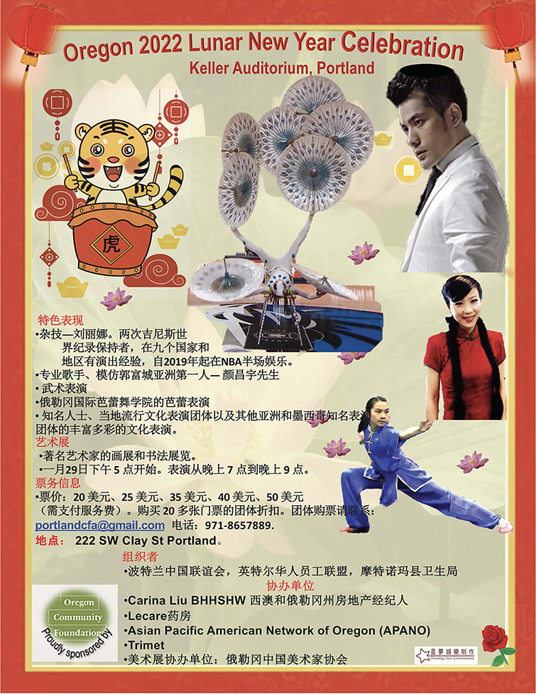 冬去春来,万象更新。为迎接农历虎年的到来,波特兰中国联谊会将携手英特尔华人员工联盟,摩特利马县卫生局等地方机构组织,于二零二二年一月二十九日晚七时在波特兰市中心的凯勒大剧院举办一场盛大的文艺晚会。