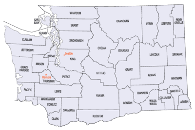 另外14个县是Adams, Asotin, Columbia, Ferry, Garfield, Grays Harbor, Lewis, Lincoln, Pend Orielle, Skamania, Spokane, Stevens, Wahkiakum 和 Whitman.