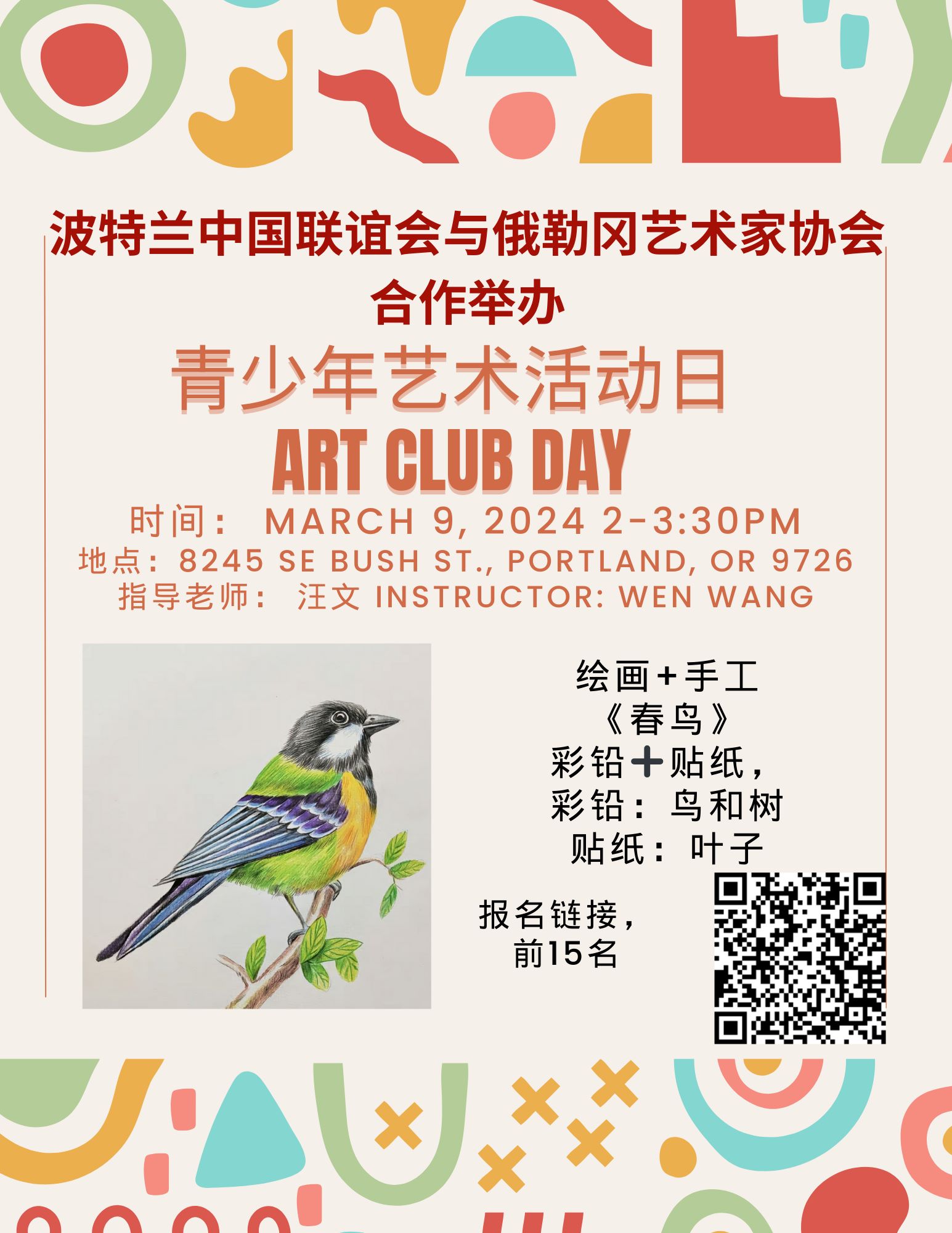 波特兰中国联谊会与俄勒冈艺术家协会合作举办青少年艺术活动日活动,名额有限,报名从速!