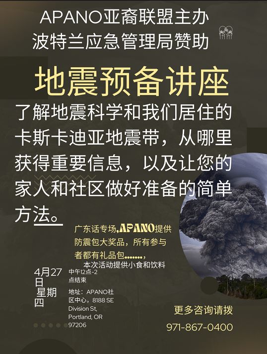 居住在波特兰地区的小伙伴们,如果有更多关于APANO举办的地震预备讲座的问题,可以致电971-867-0400了解。