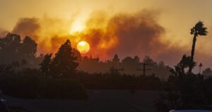 在洛杉矶南部的Orange县,黑烟在几个小时内笼罩超6平方英里。野火已经迫近Irvine市,那里有28万居民,没有火灾隔离带。