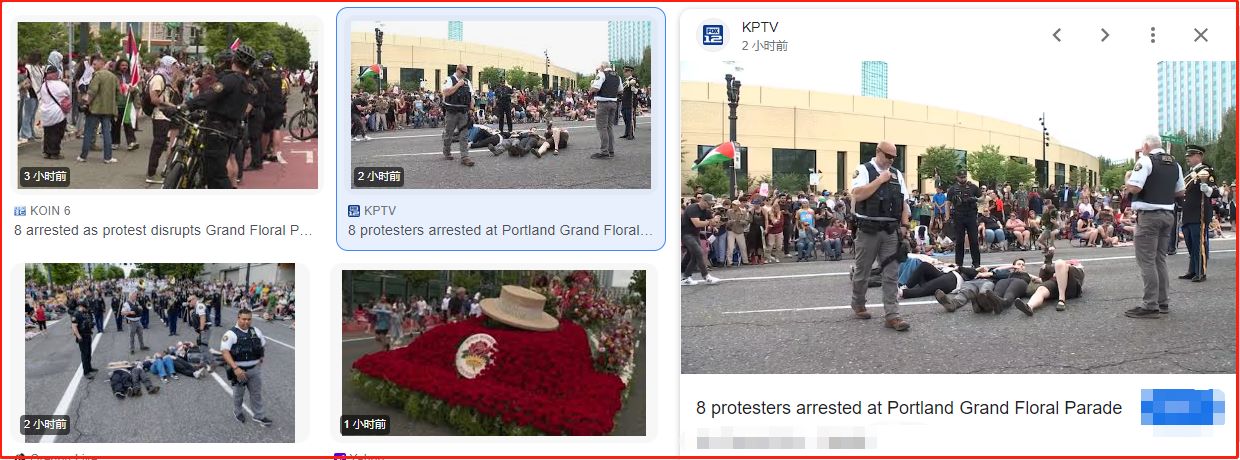 波特兰警察局报告,6月8日星期六早上,在一年一度的玫瑰节花卉游行中,有8人因试图阻挡游行路线而被捕。