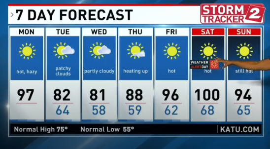 大波特兰地区很有可能打破历史最高温记录。历史上的今天最高温度记录是96度,今天可能会达到97度!俄勒冈州东部地区可能出现三位数的温度!