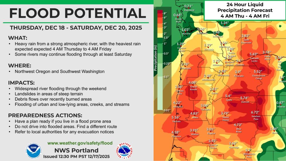 12月18日(周四)至12月20日(周六),太平洋西北再度遭遇强烈“大气河”(Atmospheric River)侵袭。国家气象局(NWS Portland)发布天气警报,预计未来48小时将出现破纪录暴雨、强风、洪水、山体滑坡与更大范围停电风险。