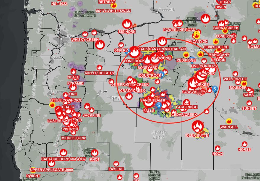 从野火地图上看,俄勒冈州东部前五大野火杜尔基野火(Durkee Fire,28.9万英亩)、瀑布野火(Falls Fire,14万英亩)、孤石野火(Lone Rock Fire,13.6万英亩)、牛谷野火(Cow Valley Fire,13.3万英亩)、猴子溪野火(Monkey Creek Fire,7.3万英亩)几乎是连成一片!