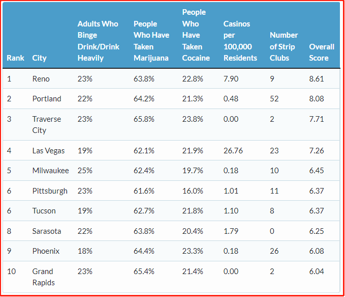 根据排名评分,波特兰22%的成年人天天醉生梦死(酗酒)、21.3%的人承认在吸食可卡因、64.2%吃大麻。