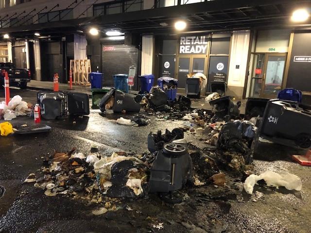 Garbage and recycle was strewn in the street before it was set ablaze. #Portland #PDX pic.twitter.com/0VEVh27FA2