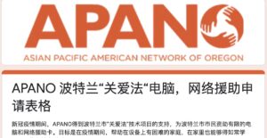 新冠疫情期间,APANO得到波特兰市“关爱法”技术项目的支持,为波特兰市市民资助有限的电脑和网络援助卡。目标是在疫情期间,帮助在设备上有困难的家庭,在家里也能够得如常学习,工作和社交联系。