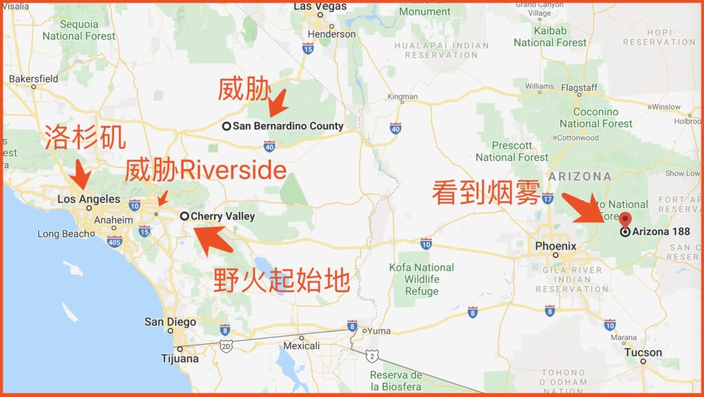 受干燥天气、微风、和茂密的植被影响,冲天大火一可不收拾,威胁到成千上万的在Riverside县和San Bernardino县的居民房屋!烟雾飘散到400英里外的亚利桑那州Globe市!