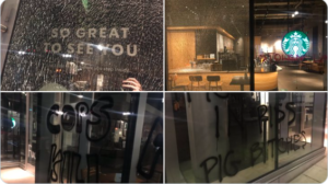 大约10点左右,暴力抗议者开始爆玻璃。包括两间星巴克在内的多间企业被砸。