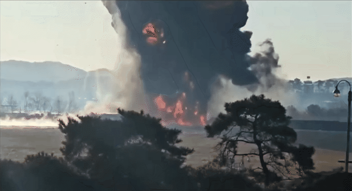 12月29日星期日,韩国发生历史上最严重的空难,一架客机在务安国际机场迫降并冲出跑道,撞上墙壁后爆炸起火,腾起一团火球。179人丧生,仅2人幸存。