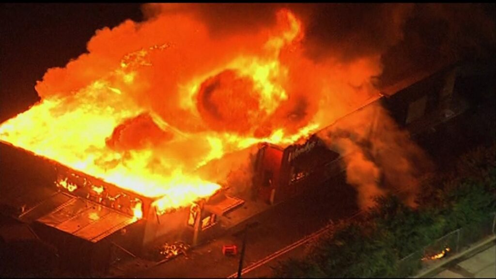 6月13日星期六晚上8点,现在发生中!美国亚特兰大示威者放火烧了Wendy’s餐馆!熊熊烈火包围了整幢建筑物。消防人员无法进入救火。