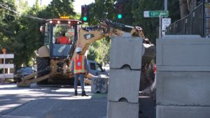 8月28日星期五早上,西雅图交通运输部的工作人员再次在西雅图东区警察局的周围设置混凝土路障!