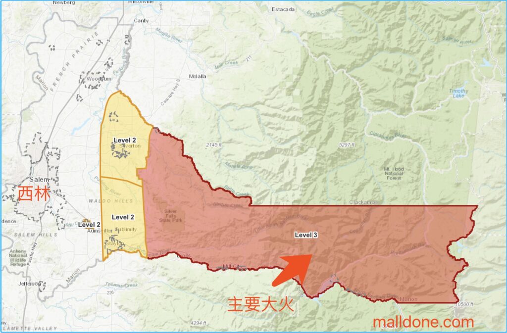 马里恩县3级撤离范围仍然包括Lyons, Mehama, Mill City, Gates, Detroit, Idanha,Silver Falls国家公园以北的214号公路至Scotts Mill。