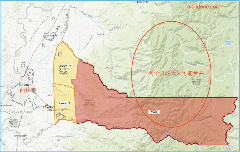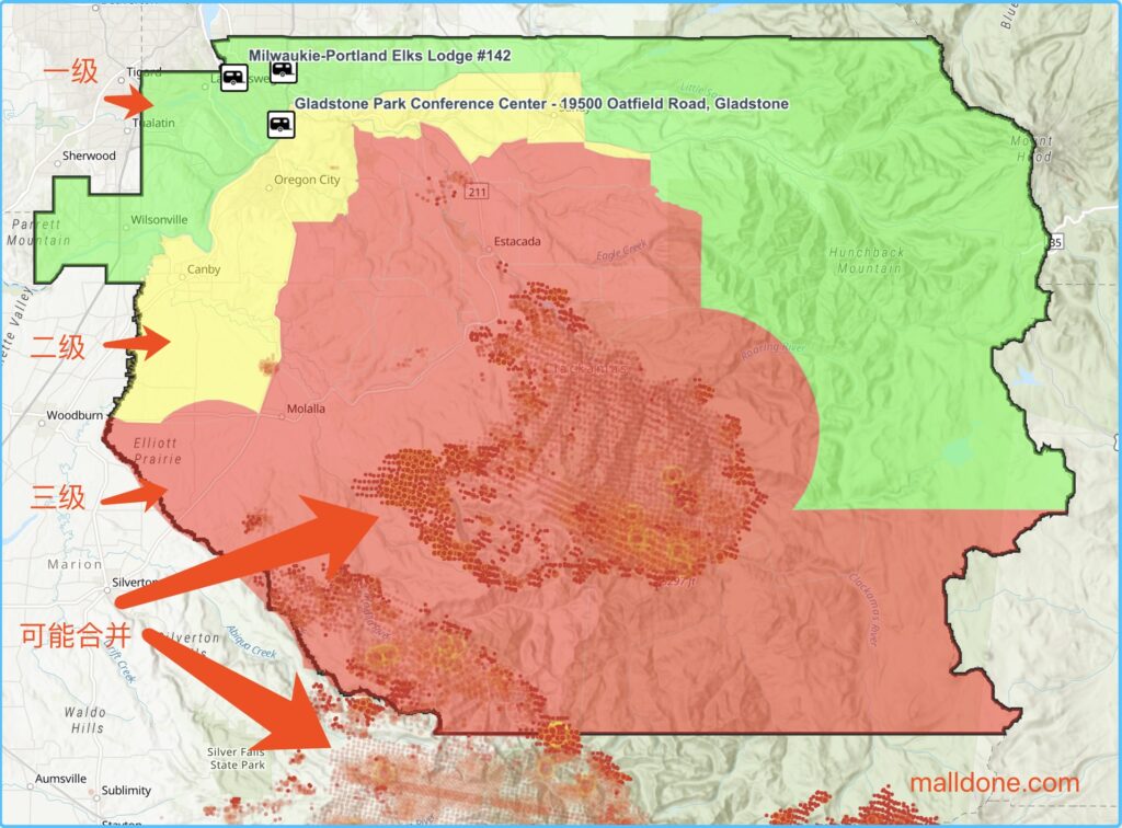 克拉克马斯县中午突然宣布Molalla三级撤离立即“走”;Oregon City, Canby,和Sandy升格为二级撤离!Oregon City东边的Riverside大火向西和西北方向推进。