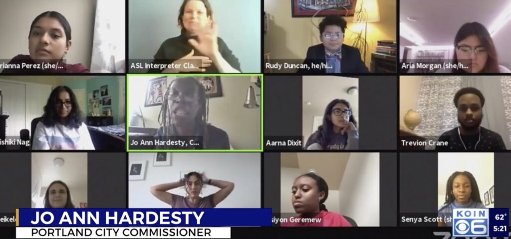 媒体报道说,波特兰市黑人女议员Jo Ann Hardesty在市政厅跟“年轻人”们开了一个会,讨论如何建立一个公平公正的城市。