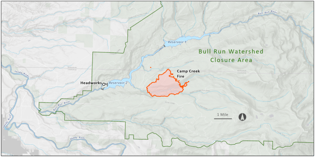 波特兰水务局更新的火灾地图显示,火灾范围扩大,向西和向南蔓延,离水库更近了,距离 1 号水库约 1.3 英里。