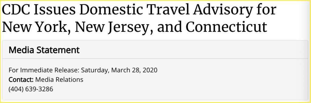 3月28日星期六,疾病控制与预防中心(CDC)对纽约州,新泽西州,和康涅狄格州发出旅行预警!