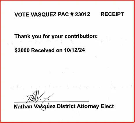 - 向摩特诺玛县地区检察官当选人内森·瓦斯奎兹(Nathan Vasquez)捐款3000美元;