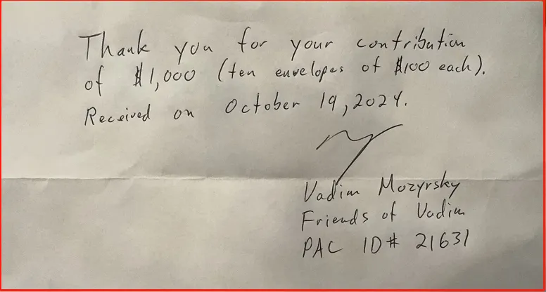 - 向摩特诺玛县议会第1选区议员候选人瓦迪姆·莫兹斯基(Vadim Mozyrsky)捐款1000美元;