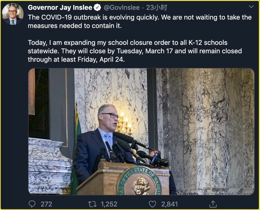 华盛顿州州长英斯利星期五下令,在新冠病毒爆发期间,全州所有学校关闭,包括公立和私立K-12学校,大学,和科技学校。