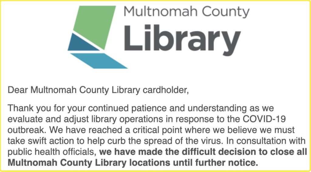 俄勒冈摩特诺玛县图书馆星期五发邮件给所有会员称,在与公共卫生官员协商后,他们做出了艰难的决定,关闭所有的摩特诺玛县图书馆,直至另行通知。