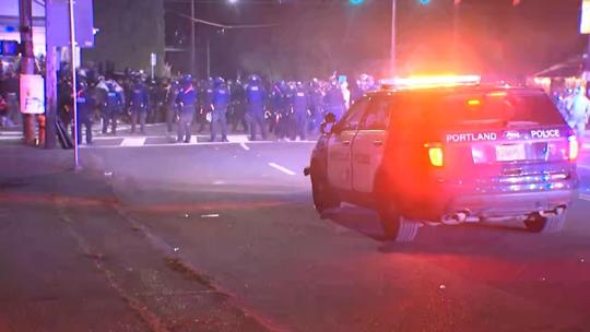 晚上10点半,波特兰警察局宣布发生暴动。大量警察出击,将暴力抗议者赶出政府大楼的范围,赶往公路。