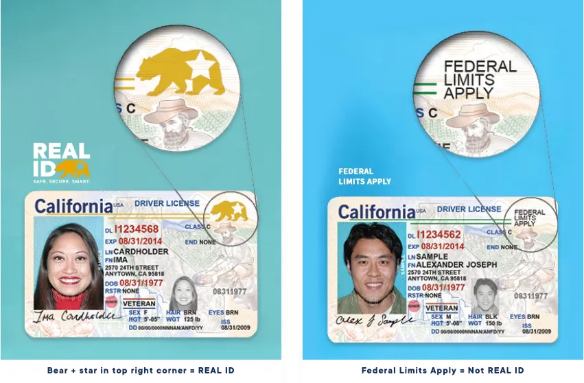 真实身份证(Real ID) 的标志是卡片右上角的 金色熊和星星组合。没有此标志的为“非真实身份证”。