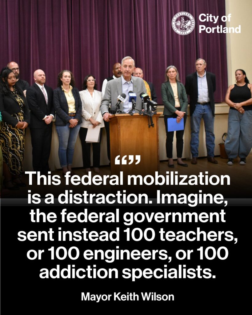 波特兰市长在波特兰东北的威斯敏斯特长老会教堂(Westminster Presbyterian Church)召开临时记者会,表示“我们并未要求联邦政府派人,他们却不请自来”。