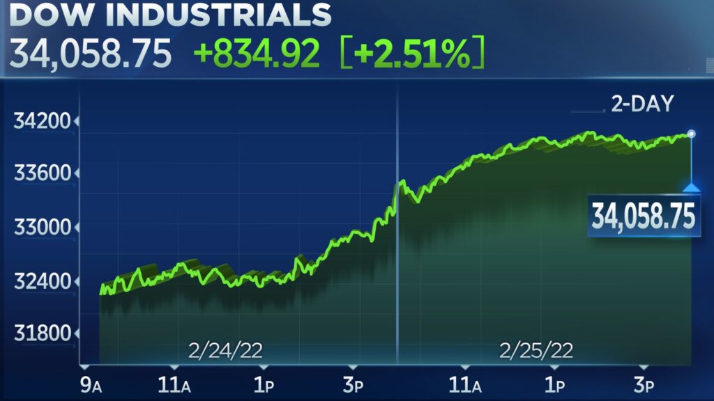 道琼斯工业平均指数上涨 834.92 点,或 2.5%,收于 34,058.75。标准普尔 500 指数上涨 2.2% 至 4,384.65 点。纳斯达克综合指数上涨 1.6% 至 13,694.62。