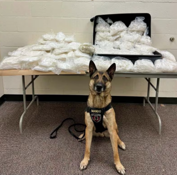 警犬在汽车的后备箱发出警报。打开一看,发现一个大手提箱、一个行李袋和黑色垃圾袋,全是冰毒品,约207磅!另外还有2.2 磅海洛因。