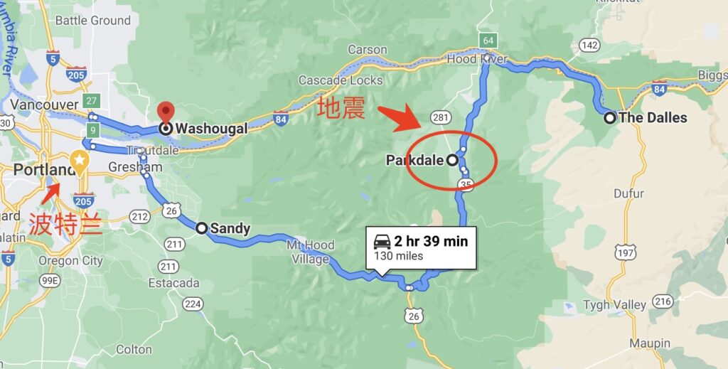 震中位于达勒(Dalles)西南约21英里处,桑迪(Sandy)东北东北33英里处,沃苏加(Washougal)东约37英里。