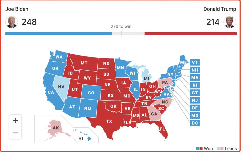 截至发稿,拜登拿下248张选举人票,特朗普则有214张。