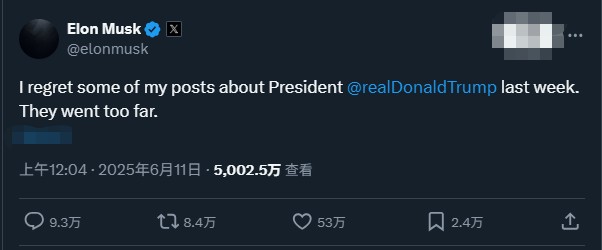 就在上周还怒斥特朗普“疯了”“忘恩负义”,并暗示他阻挠释放爱泼斯坦(Jeffrey Epstein)文件的埃隆·马斯克,这次忽然放软了态度,深夜发文认错:“我对上周关于特朗普总统的某些发言感到后悔,确实说得太过了。”