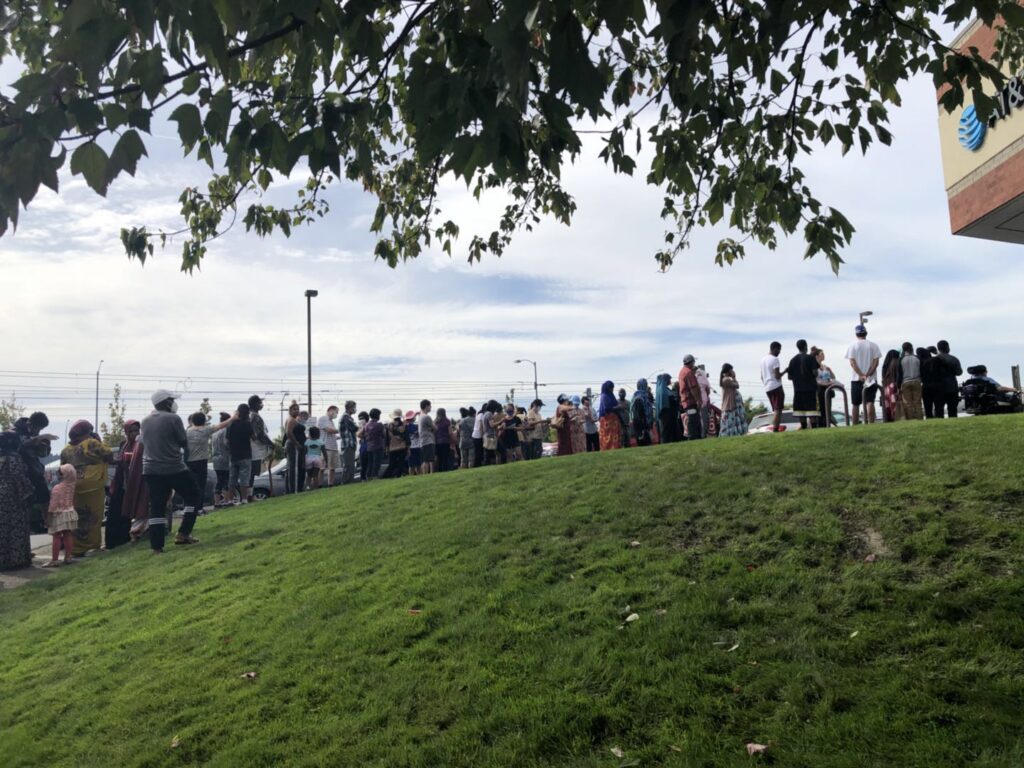 到处都是黑人和包头包颈的人在排队,排了一圈又一圈,场面异场壮观!华人白人也有排队申请的。