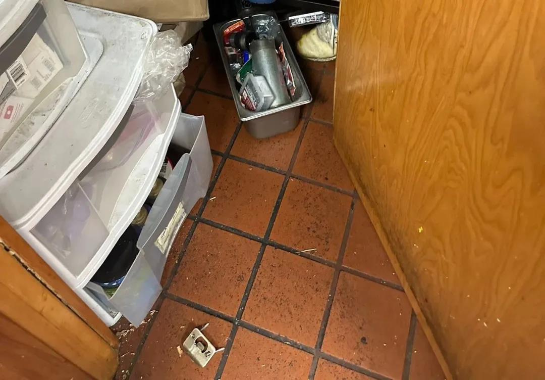失望的窃贼随后转入办公室,撬破门,再次翻箱倒柜,寻找财物,又停留了5分钟以上。