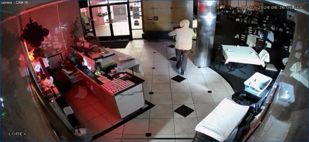 当天清晨6点左右,窃贼打破了鱼乐轩的玻璃,钻入餐馆内。