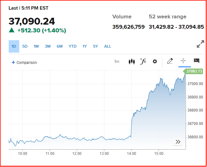 道指(Dow Jones)收涨1.4%,收于37090.24点,盘中更是触及37094.85。史上最高!发财机会?吼吼吼!