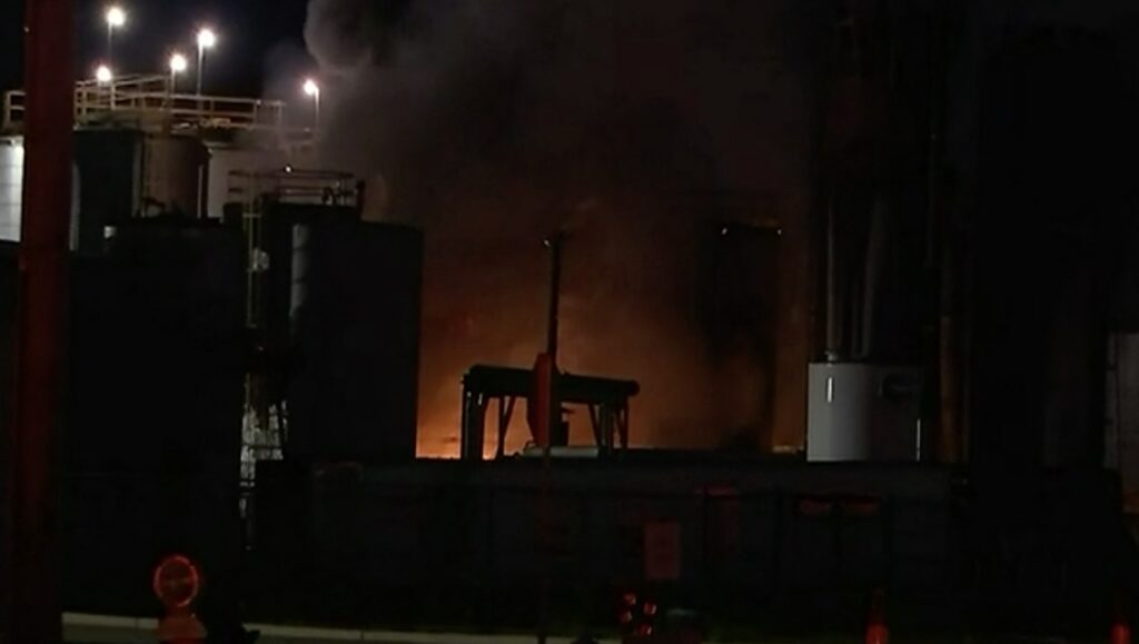 消防官员说,大火是由两个液体沥青料仓的供应管道故障引发的。其中一条生产线包含70吨物料。