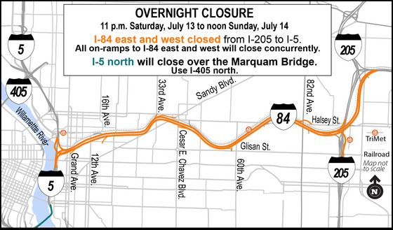 俄勒冈州交通部(ODOT)宣布,从7月13日星期六晚上11点到7月14日星期天中午,位于波特兰的84号州际公路将大范围关闭,以进行涂鸦清理和垃圾清除工作。
