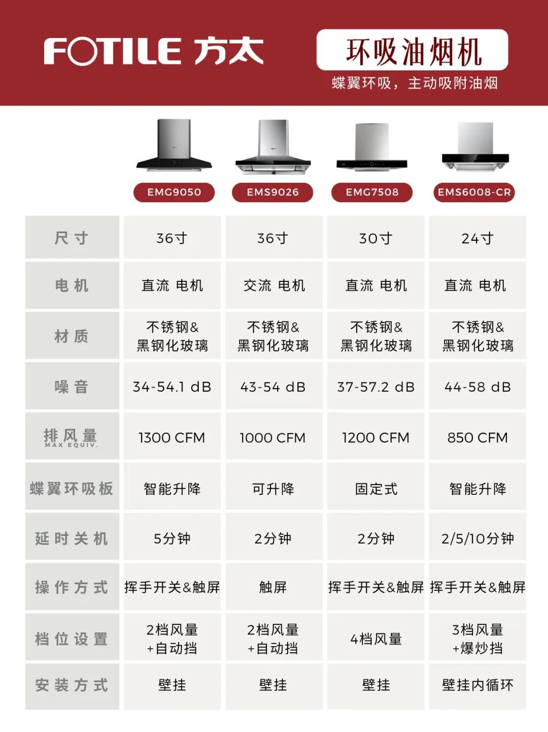 开放式厨房好搭档!专利蝶翼环吸版,主动吸附油烟,实现四面全方位进烟。36寸烟机可涵盖7.2 sq.ft.的烹饪区 (5-6个炉头)。自动巡航增压功能,确保排烟时刻畅通无阻。EMG9050带有智能升降的蝶翼板, 能够自动检测油烟大小,同时进行环吸板高度调整。在黄金控烟区,强势拢烟减少逃逸。超大油杯,卡扣式净畅网,让清洁更轻松。