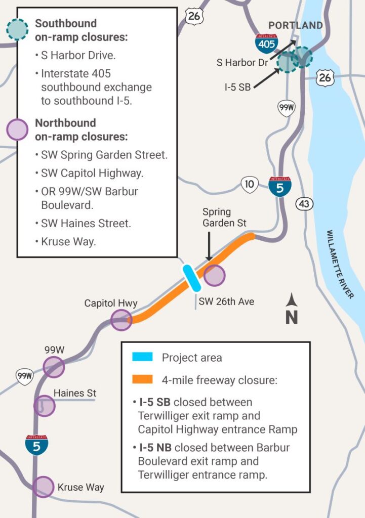 关闭的5号公路路段长约4英里,从Terwilliger大道起,至Capitol高速公路出口之间。