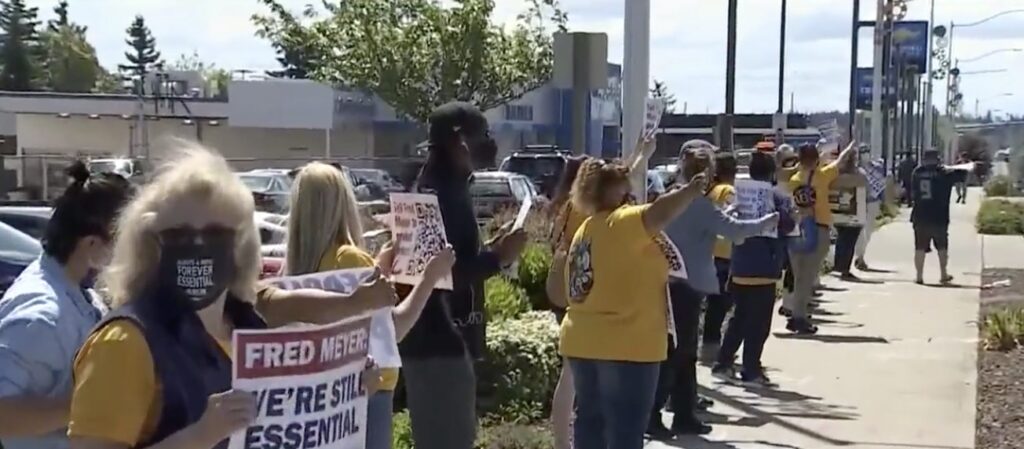 星期五,Fred Meyer和QFC的员工在Burien,Bellingham,和其他Kroger拥有的商店外面示威请愿。