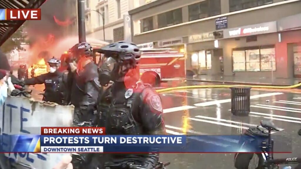 很多戴着口罩的抗议者抢劫和破坏市中心的商店。一些进入市中心的星巴克,门上喷了“ F – 警察”。其他人则通过一扇破碎的窗户进入Nordstrom百货连锁商店,将商店里的物品扔到欢呼的人群中,一件不留。
