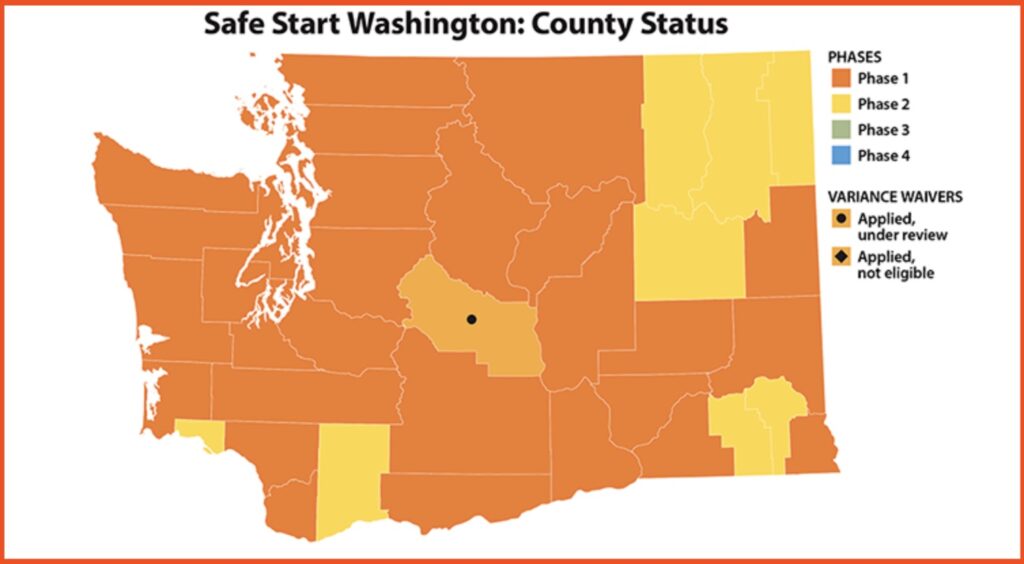 目前,华盛顿州全州处于重启第一阶段,另有8个县已经进入重启第二阶段: Wahkiakum, Skamania, Stevens,Columbia, Garfield, Lincoln, Ferry 和 Pend Oreille。
